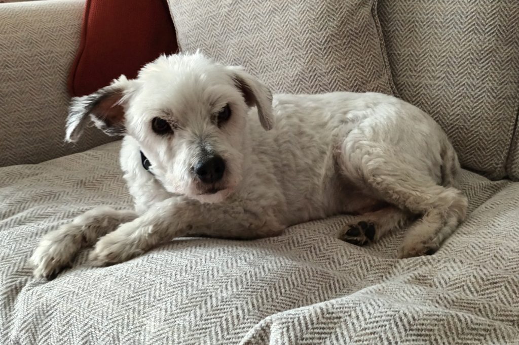 Hi from little me -my name is Alfie and I am 15 years young . I used to live with my Dad but he died and then his son carried on looking after me for a couple of years.Sadly though he needs to be away a lot so I have come to live with a foster mum at ADIN. I would really like my to have my forever home. I am virtually blind but manage really well once I learn the layout of your home and garden. I do not like other dogs or babies/toddlers if they come close and may bark and nip if I could, but I am not very large so can be easily distracted or kept away. I do like to be with my humans and potter in the garden and be in the car with them…have you a sofa I could share please?